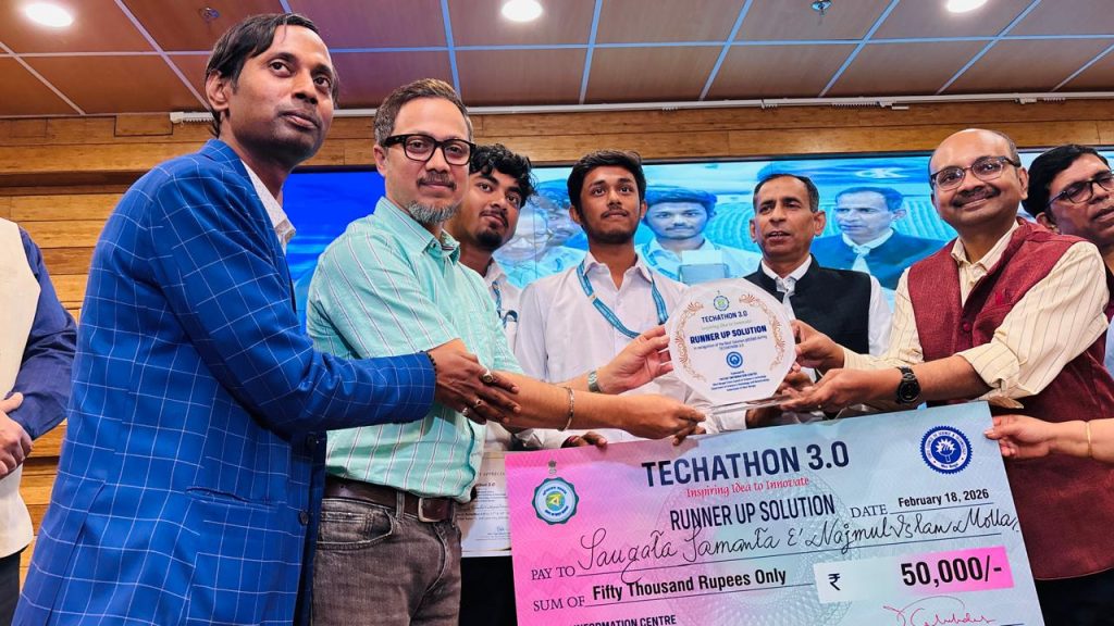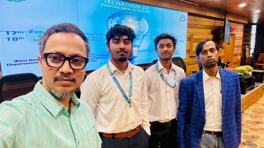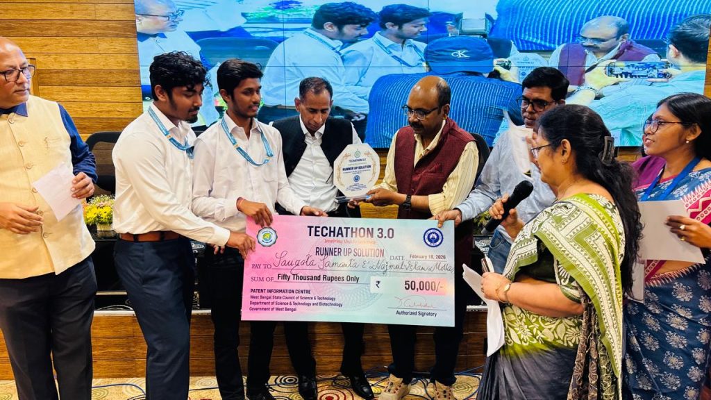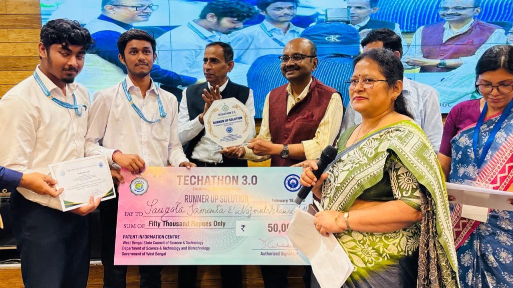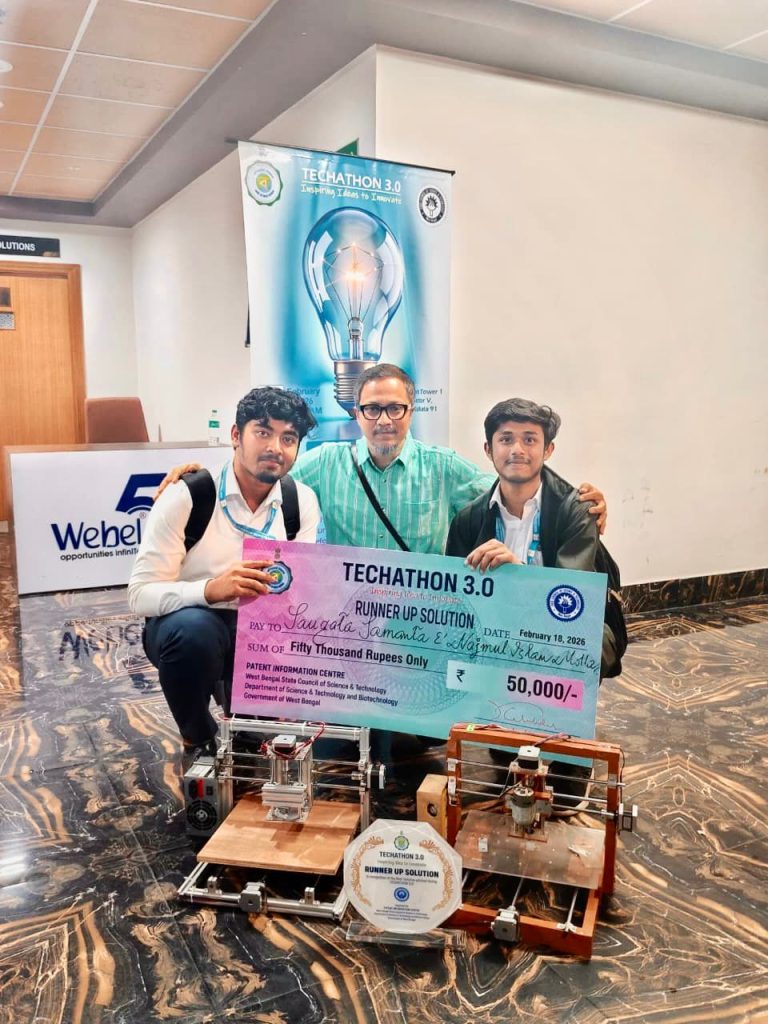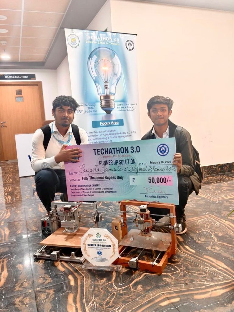 Mr. Saugata Samanta and Mr. Najmul Islam Molla, 3rd-year students of the Department of Electrical & Electronics Engineering (EEE), have secured the Runner-Up Solution (2nd Position) at the prestigious TECHATHON 3.0. Their innovative solution was recognized among 28 shortlisted best solutions presented by students from various institutions in the second round of the competition.